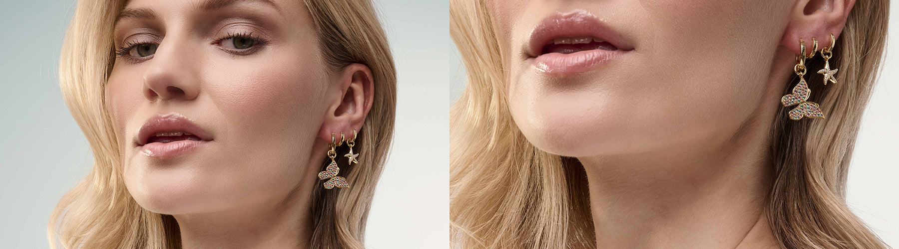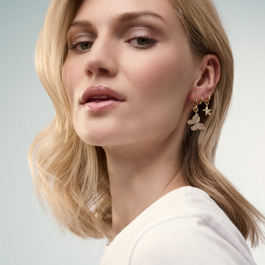 Hoop Charms er en unik måde at personlisere dine øreringe på. Hver charm er designet til at passe perfekt til enhver hoop-ørering, der er inden for en bredde på 2,5 mm. Få fat i en enkelt charm for et trendy asymmetrisk look eller to charms for at få dine blændende hoops til at matche. Valget dit!
