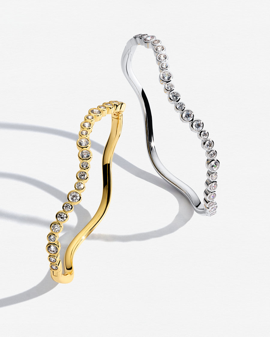 SHOP NUNye designs, der fremhæver kollektionens karakteristiske flydende formsprog gennem spejlblanke overflader og blidt funklende sten.