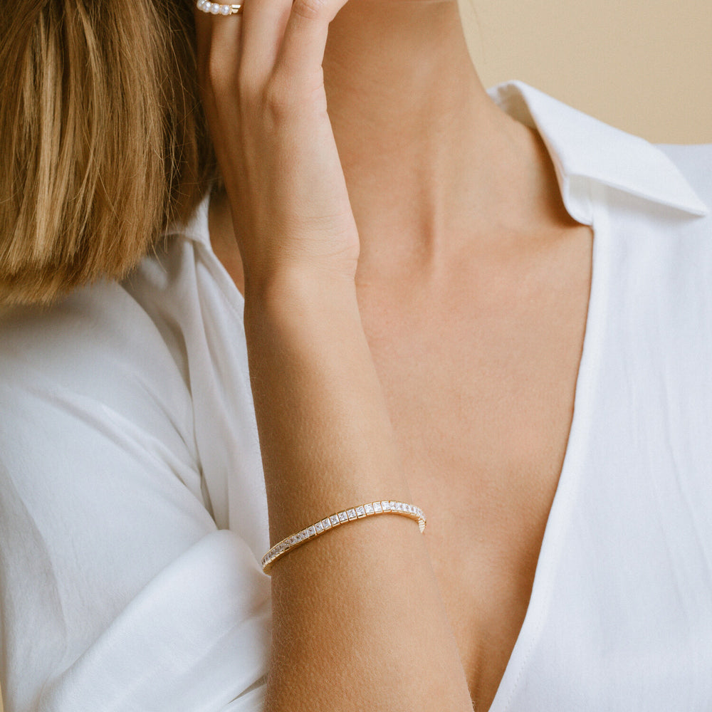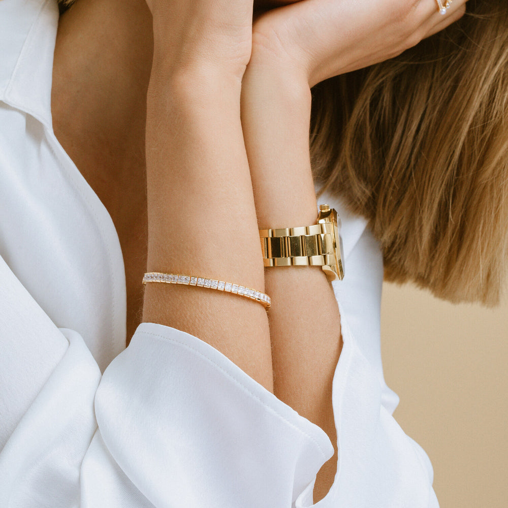 Armbånd i sterlingsølv 925 forgyldt med 18 karat guld med blankpoleret overflade og facetslebne hvide zirkoner.