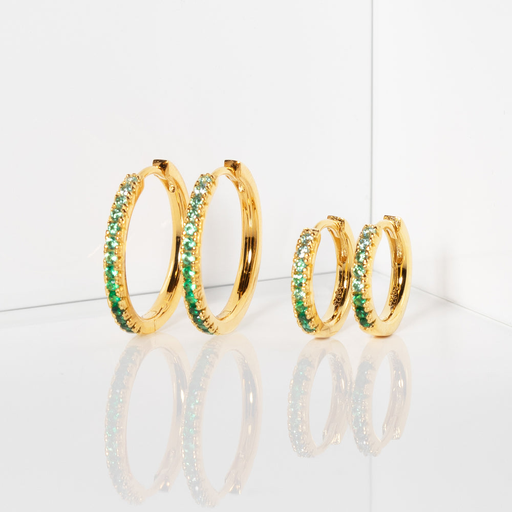 Øreringe lavet af 18 karat forgyldt 925 sterlingsølv, poleret overflade og indfattet med facetterede zirkoner i gradienttoner af grøn og hvid.