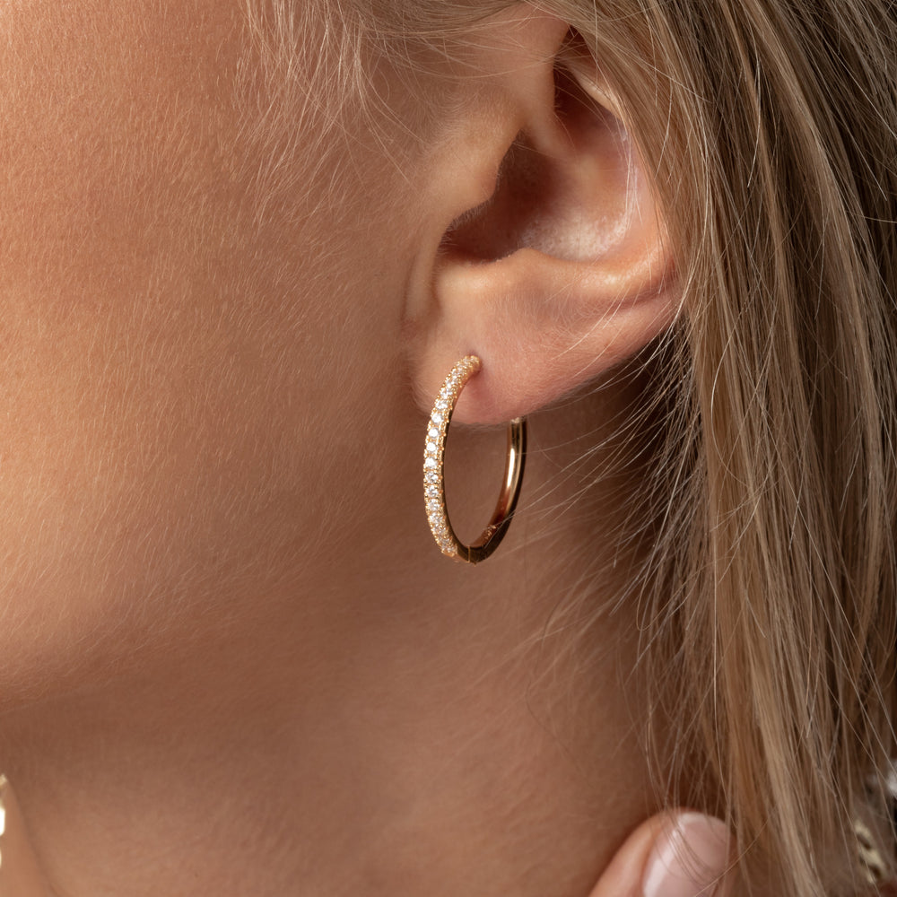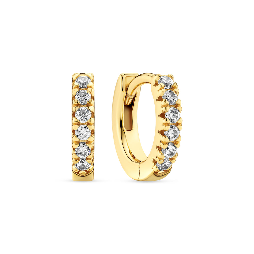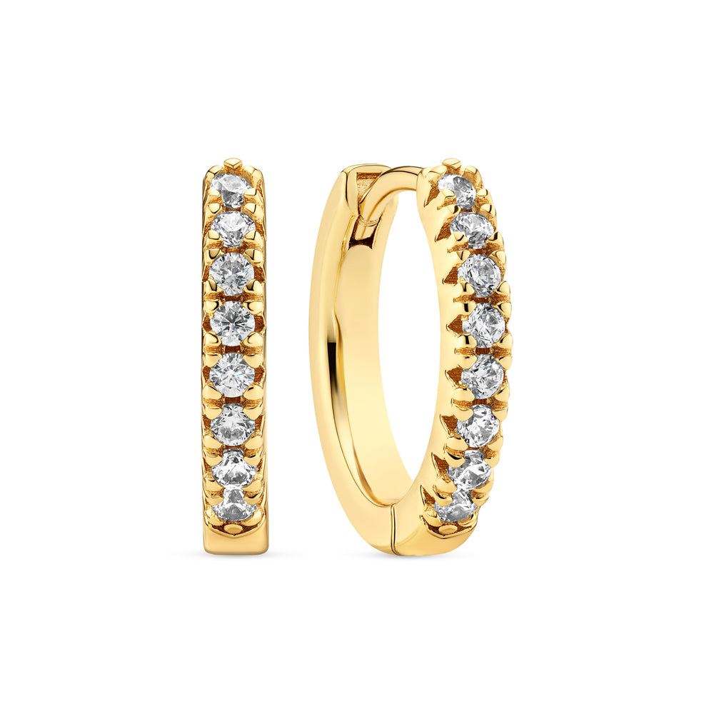 Øreringe i sterlingsølv 925 forgyldt med 18 karat guld med blankpoleret overflade og facetslebne hvide zirkoner.