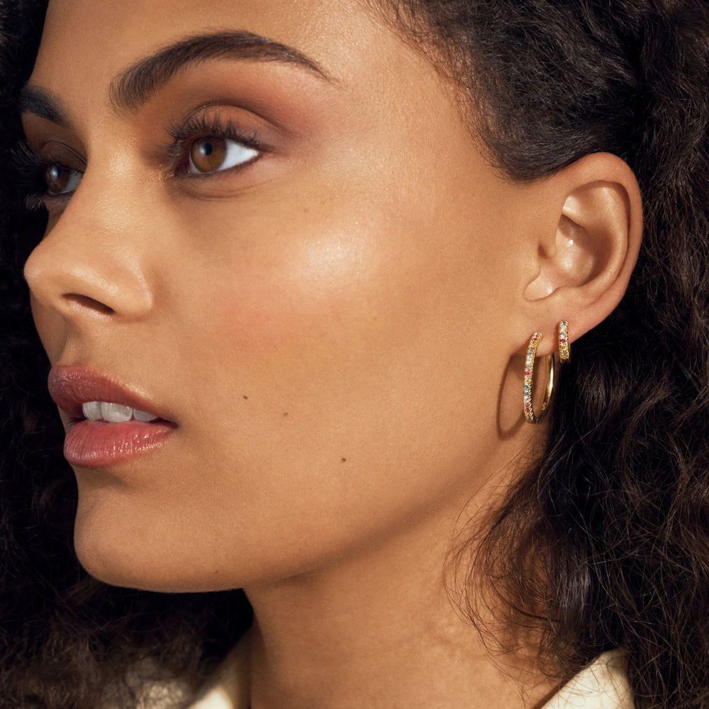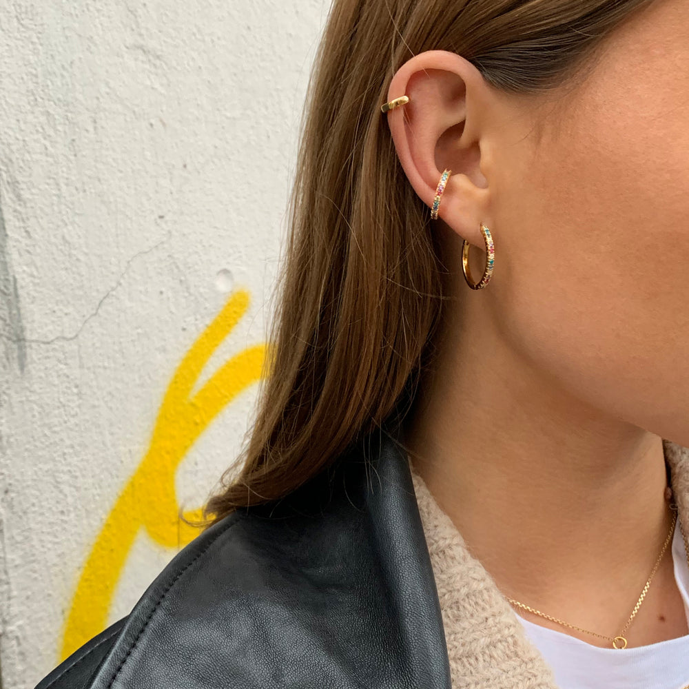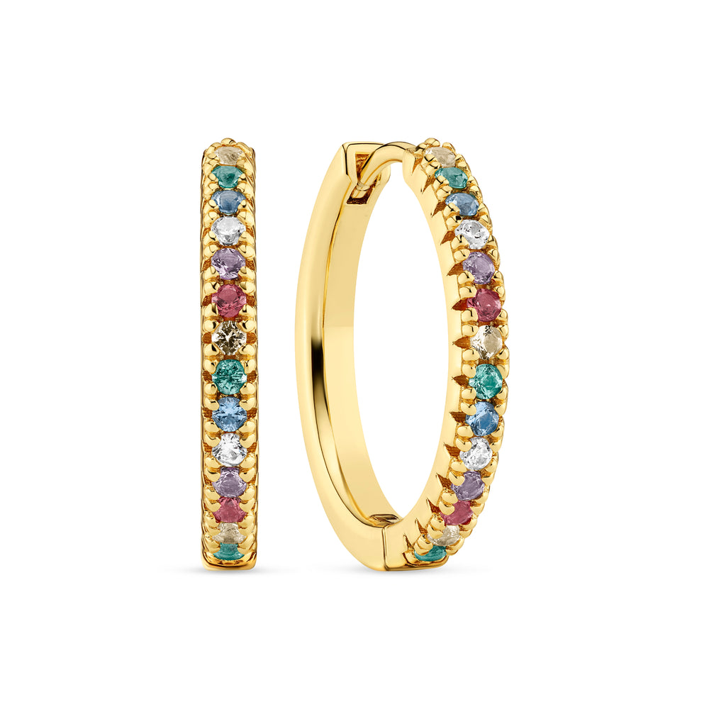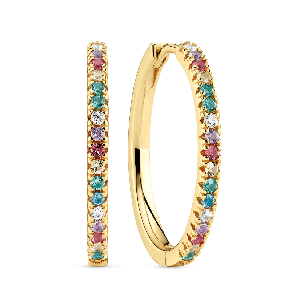 Øreringe i sterlingsølv 925 forgyldt med 18 karat guld med blankpoleret overflade og facetslebne multifarvede zirkoner.