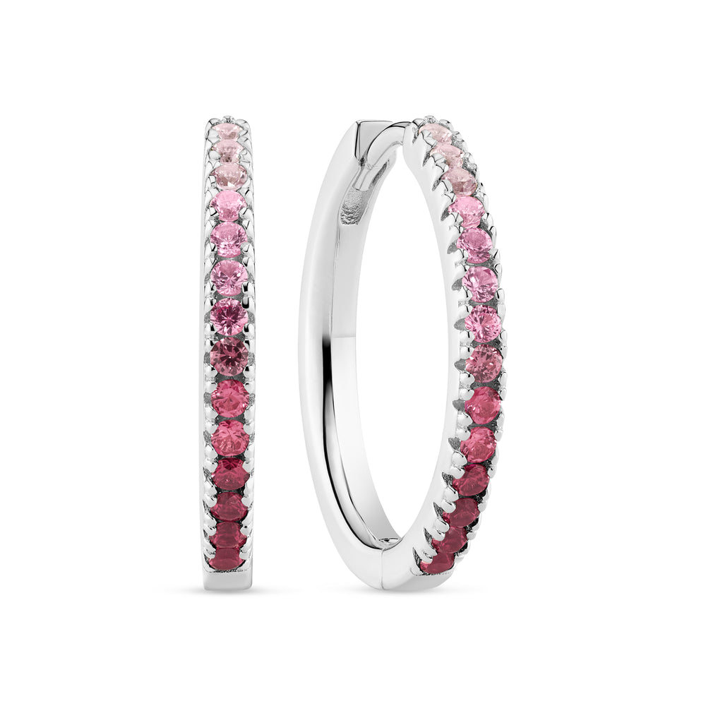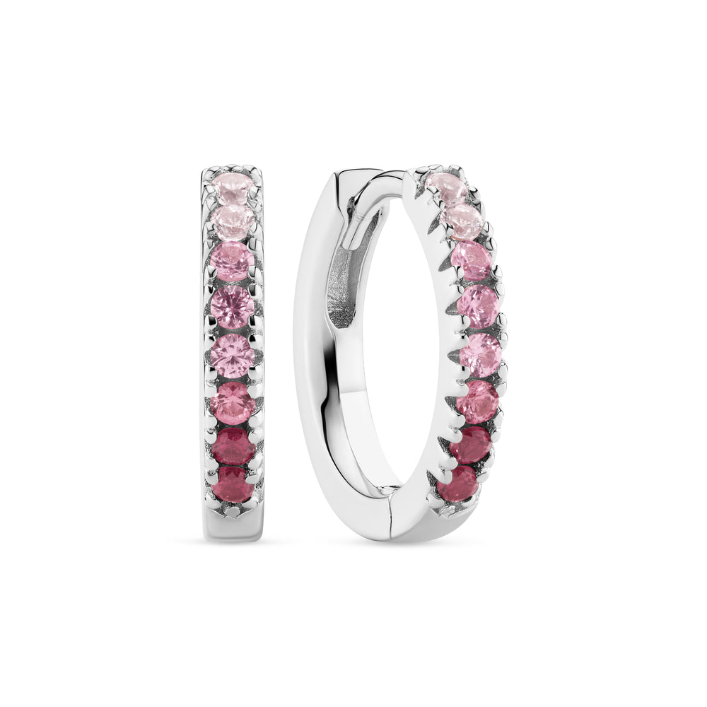 Øreringe lavet af 925 Sterling sølv med rhodium, poleret overflade og indfattet med facetterede snit i gradienttoner af pink og hvide zirkoner.