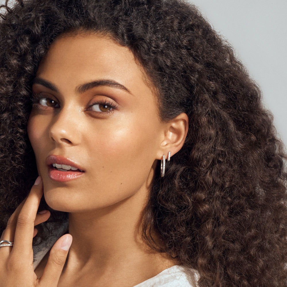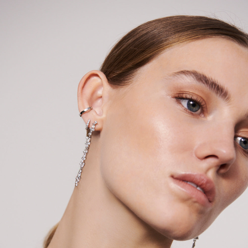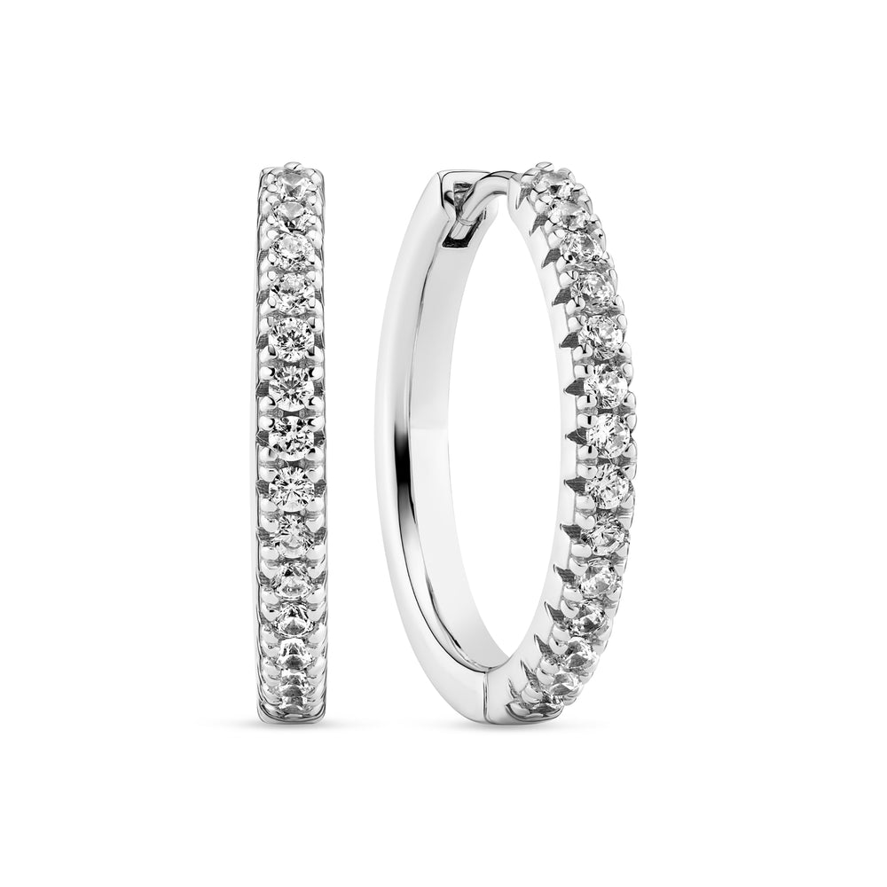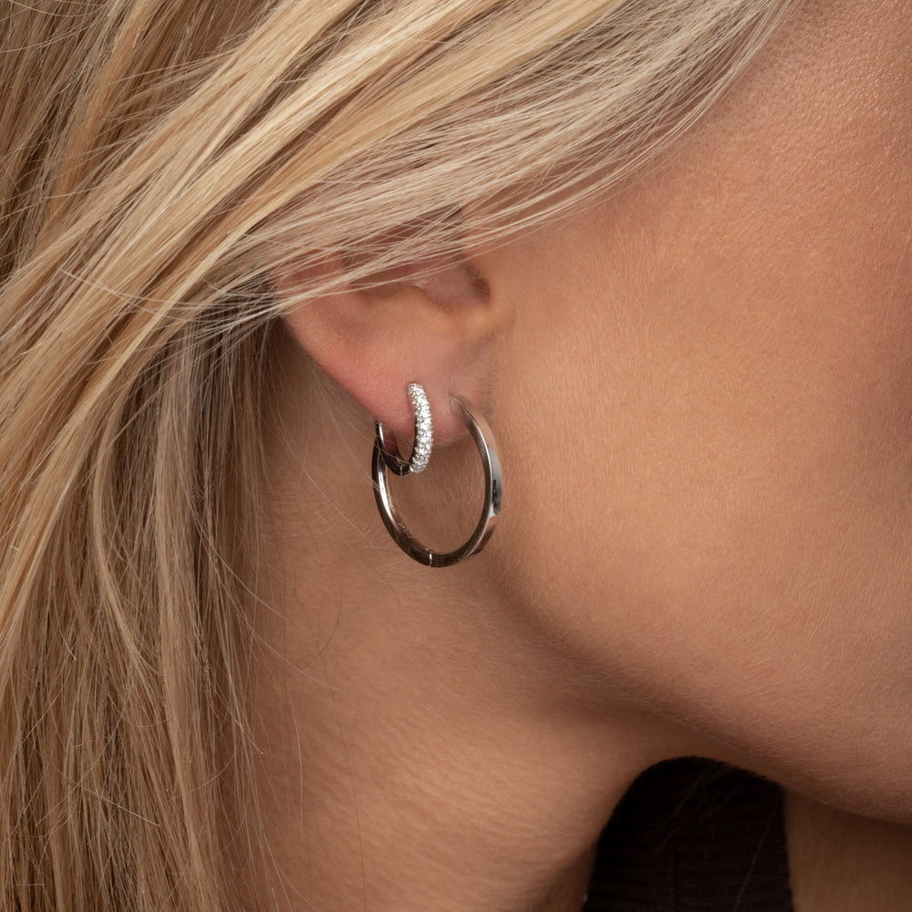 Øreringe udført i rhodineret 925 sterlingsølv, blankpoleret overflade og håndsatte facetslebne hvide zirkoner.