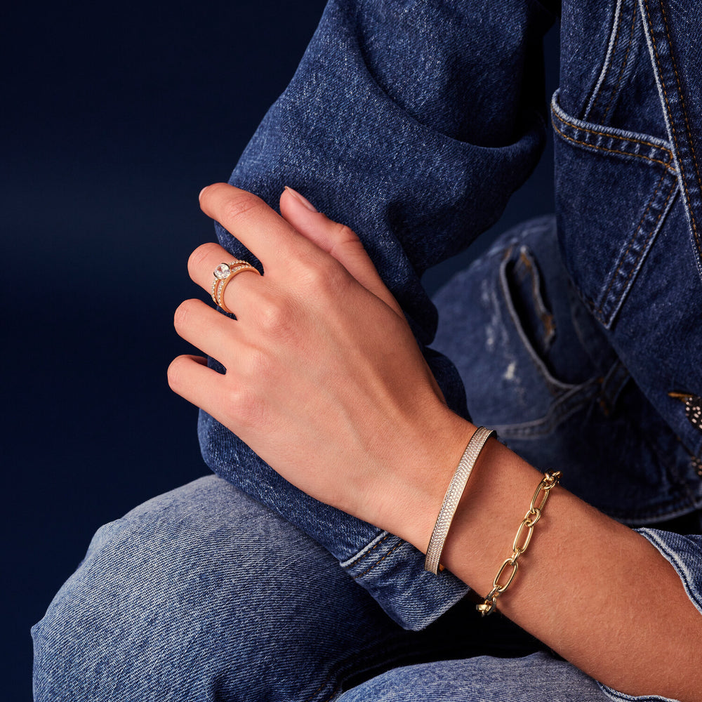 Alle vores smykke er lavet af 925 sterlingsølv, belagt med rhodium eller 18 karat guld for at opnå en elegant finish.