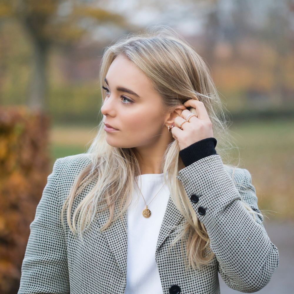 Alle vores smykke er lavet af 925 sterlingsølv, belagt med rhodium eller 18 karat guld for at opnå en elegant finish.