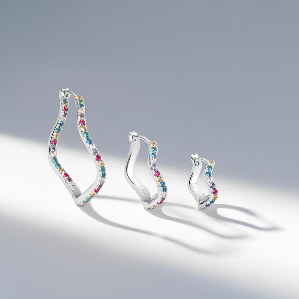 Øreringe af rhodineret 925 sterling sølv, poleret overflade og håndsat med facetterede multifarvede zirkoner