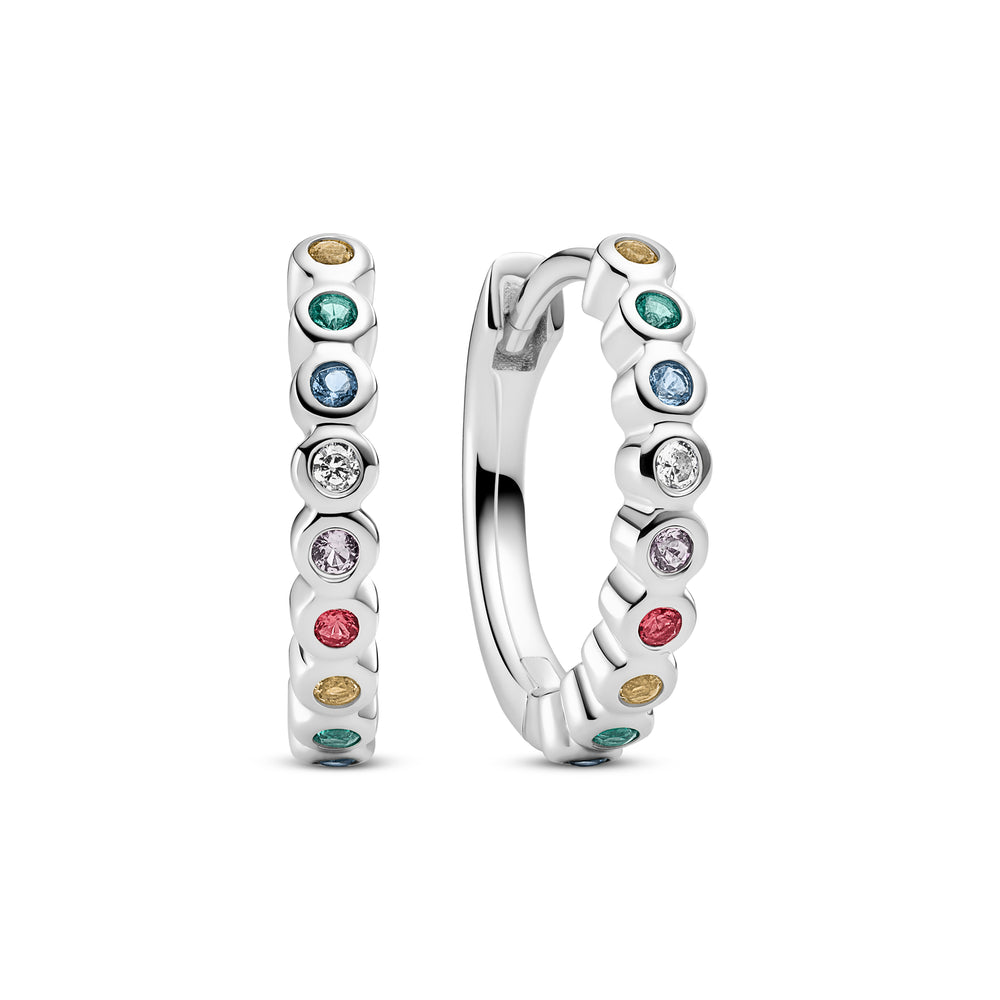 Øreringe af rhodineret 925 sterlingsølv, med en poleret overflade og håndsatte facetslebne multifarvede zirkoner.
