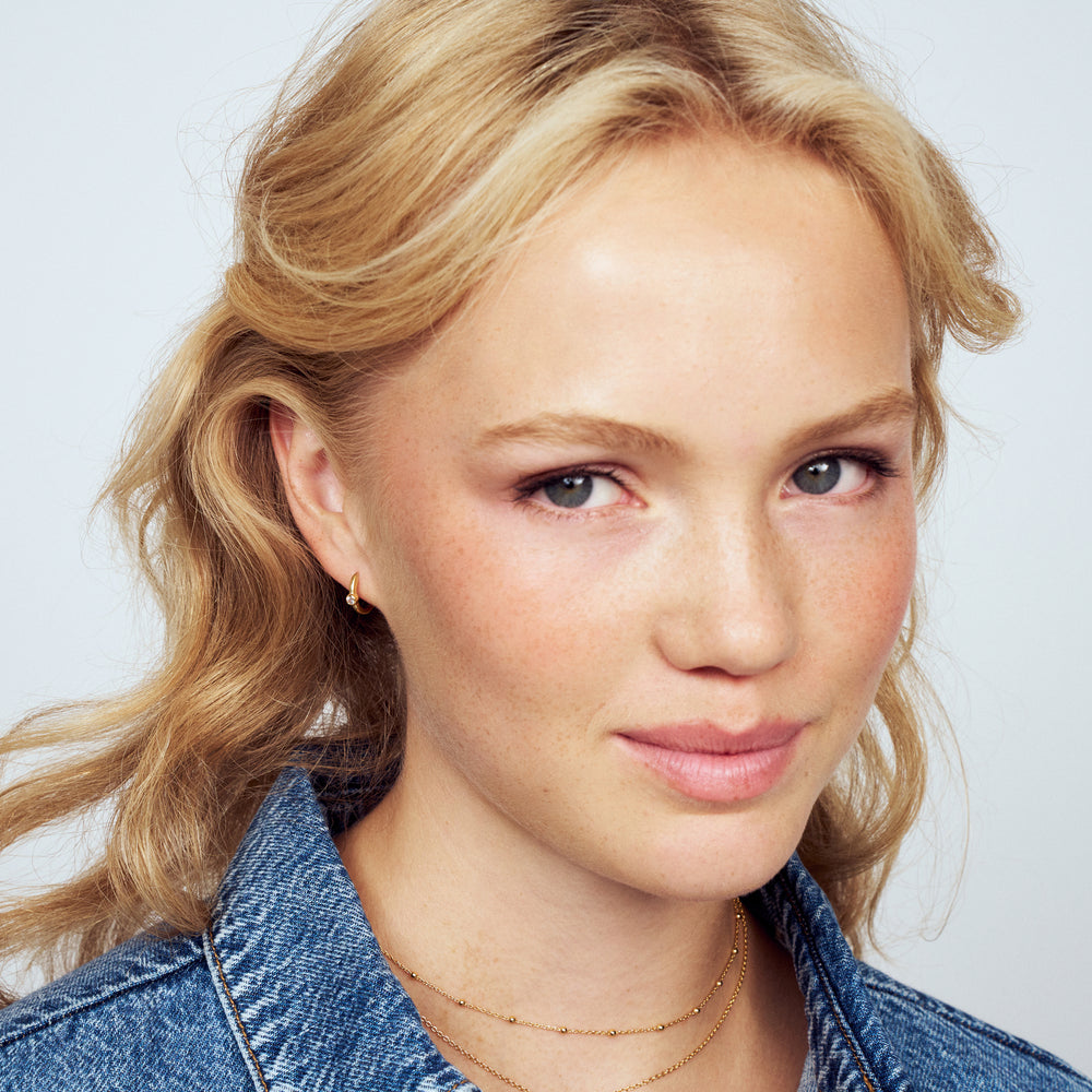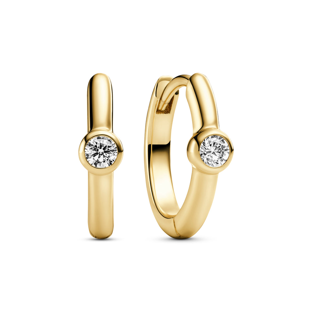 Øreringe af 18 karat forgyldt 925 sterlingsølv, med en poleret overflade og en håndsatte facetslebet hvid zirkon.