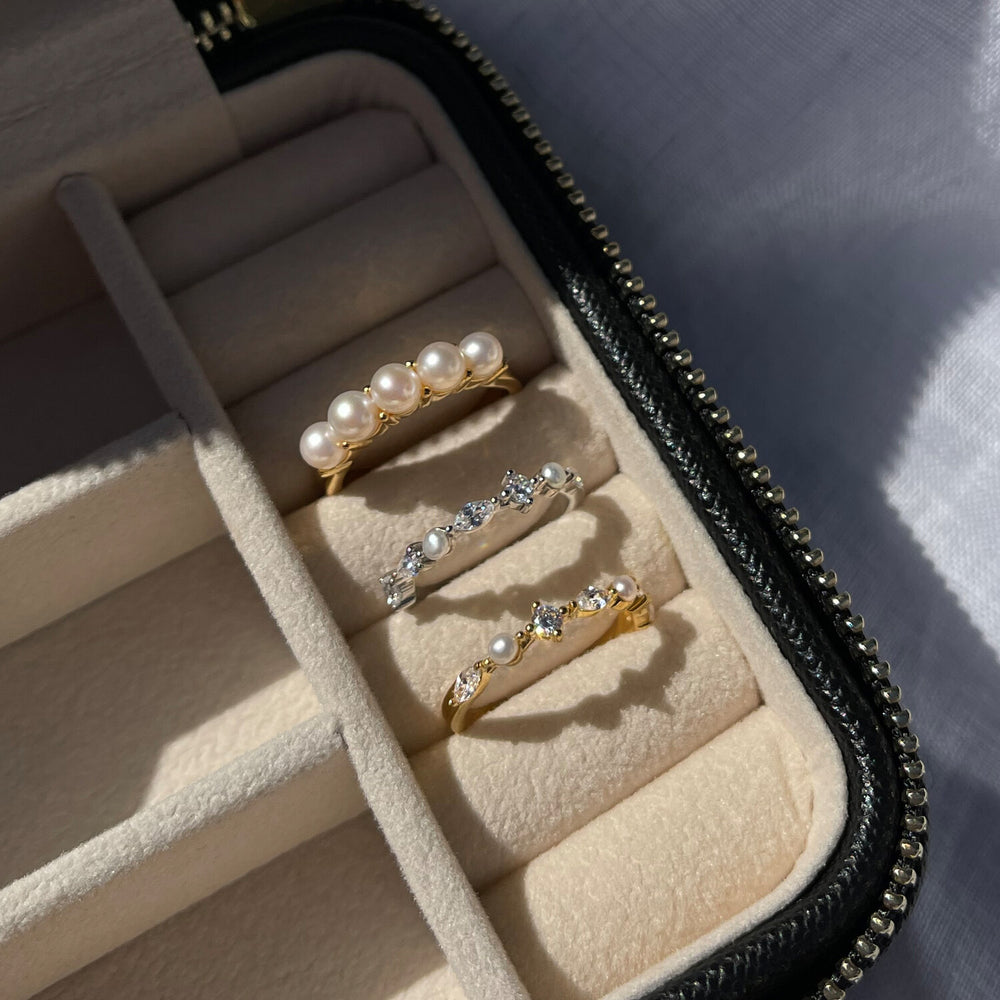 Ring i rhodineret 925 sterling sølv, blankpoleret overflade, med håndsatte facetslebne hvide zirkoner og ferskvandsperler.