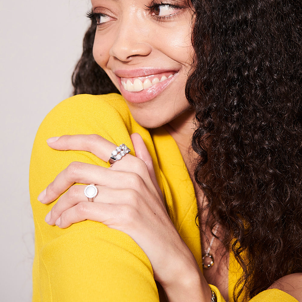 Ring i rhodineret sterlingsølv 925, blankpoleret overflade og facetslebne hvide zirkoner.