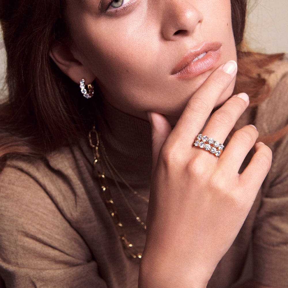 Ring i sterlingsølv 925 forgyldt med 18 karat guld med blankpoleret overflade og facetslebne hvide zirkoner.