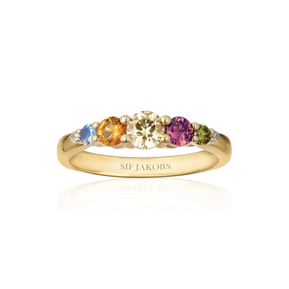 Ring i 925 sterlingsølv forgyldt med 18 karat guld, blankpoleret overflade og facetslebne multifarvede zirkoner