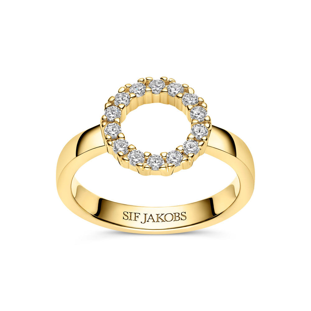 Ring i sterlingsølv 925 forgyldt med 18 karat guld med blankpoleret overflade og facetslebne hvide zirkoner.