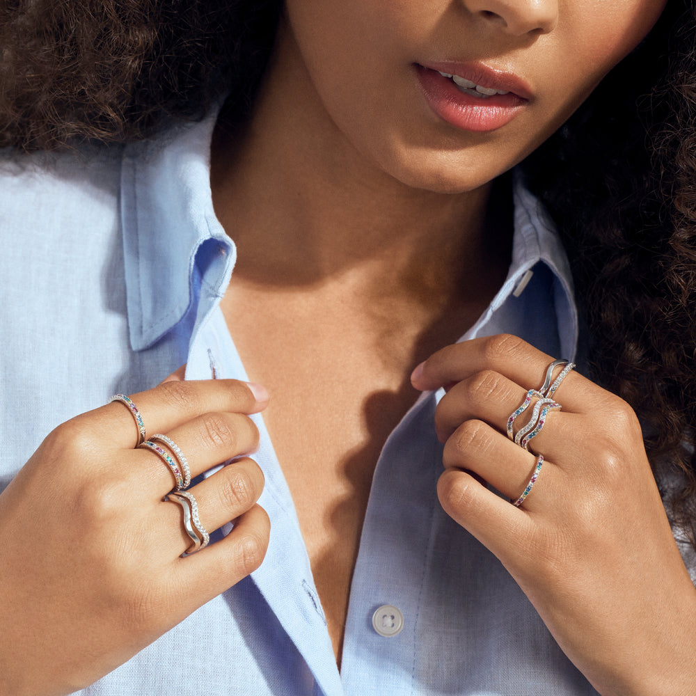 Ring af rhodineret 925 sterling sølv, poleret overflade og håndsat med facetterede multifarvede zirkoner