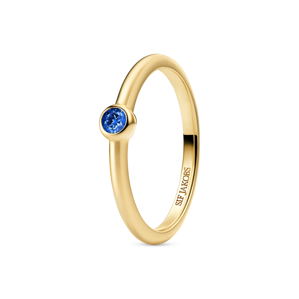Ring af 18 karat forgyldt 925 sterlingsølv, med en poleret overflade og en håndsat facetslebet blå zirkon.